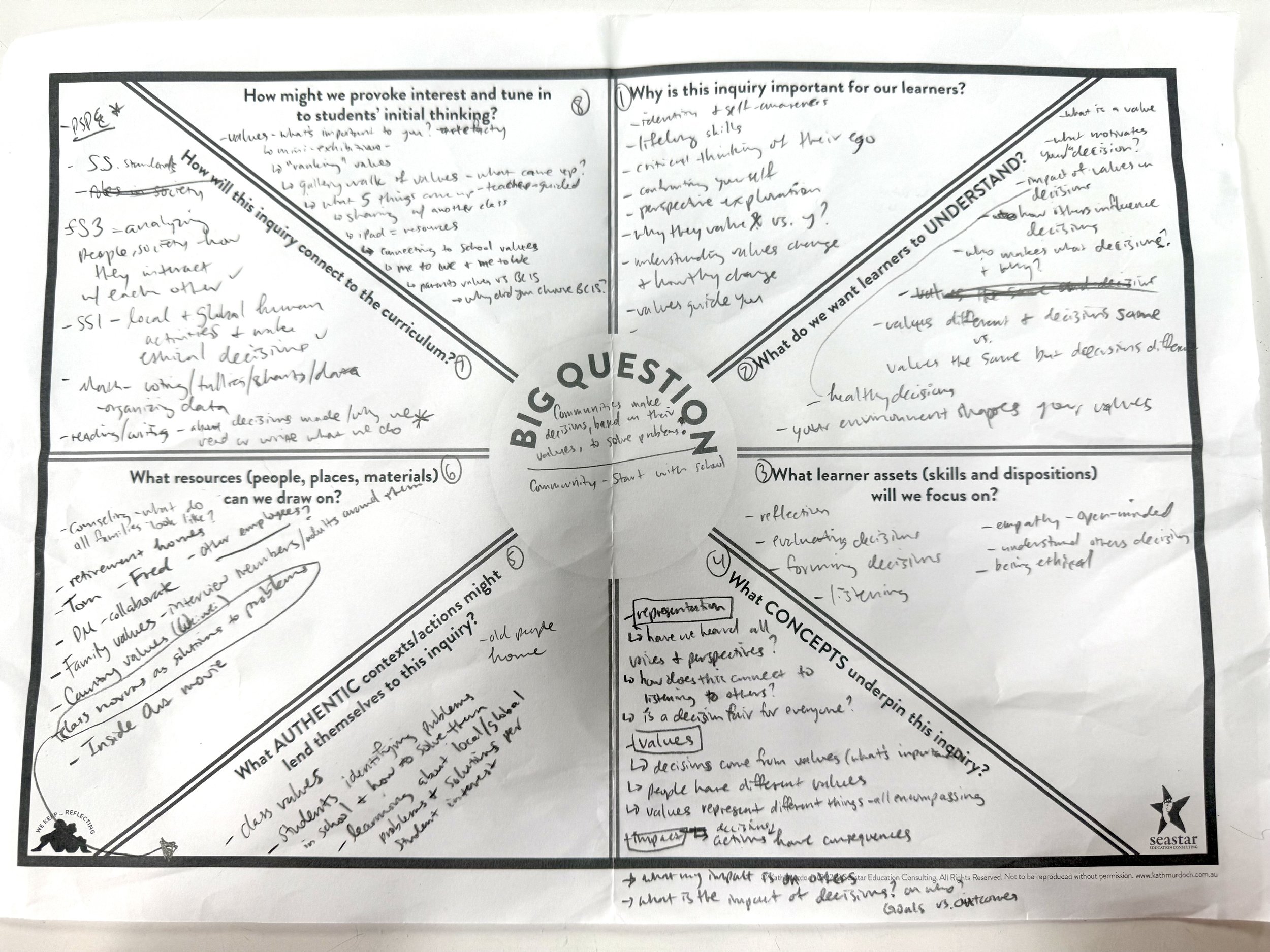 From one of my professional development (PD) conferences, I got this planning wheel from Kath Murdoch that posits really great questions and prompts to get the conversation going. We have used this in the past to varying degrees of success. Often these graphic organizers or processes can take away the dynamic nature of the conversation. It becomes another box to fill versus something we can use and refer to constantly.