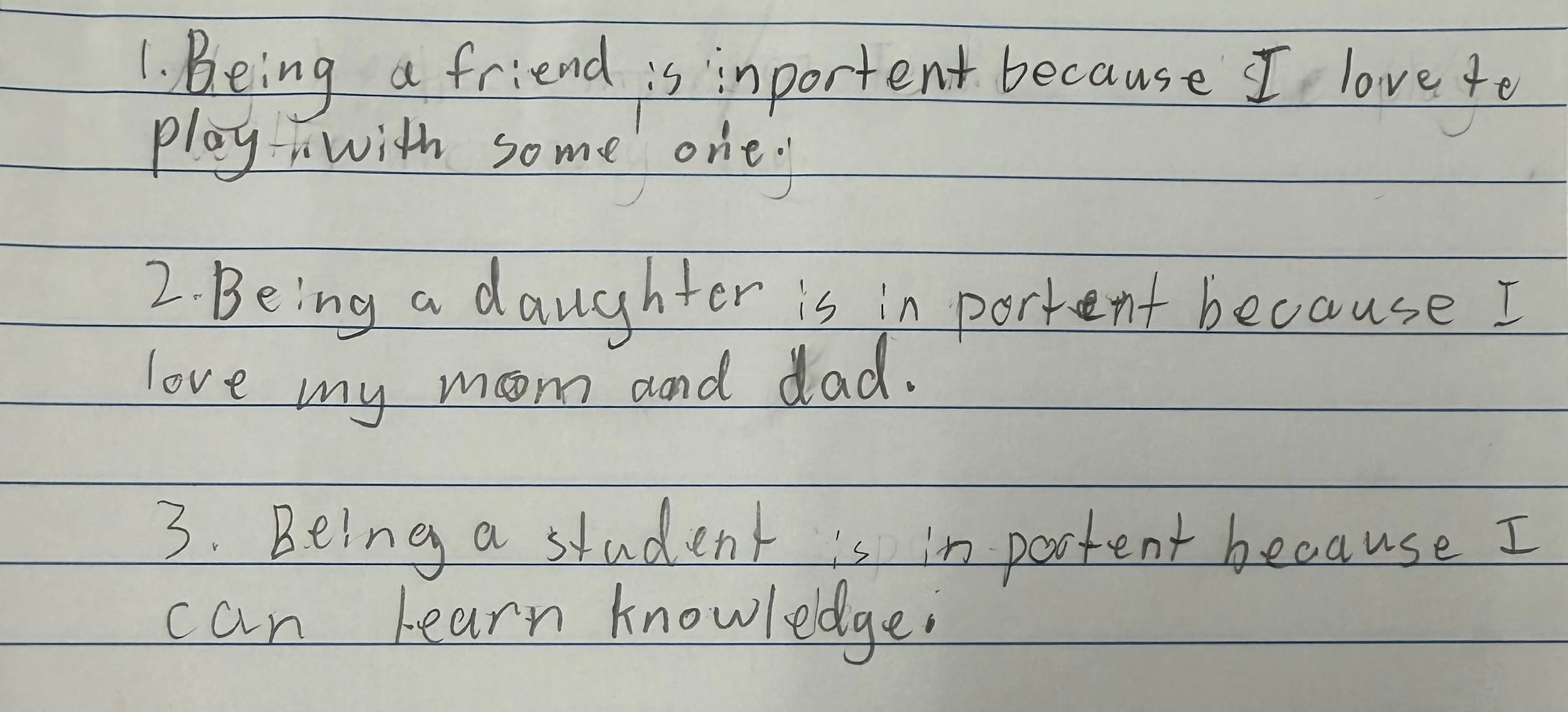 As a scaffold, I supplied the sentence frame: Being a _________ is important to me because….